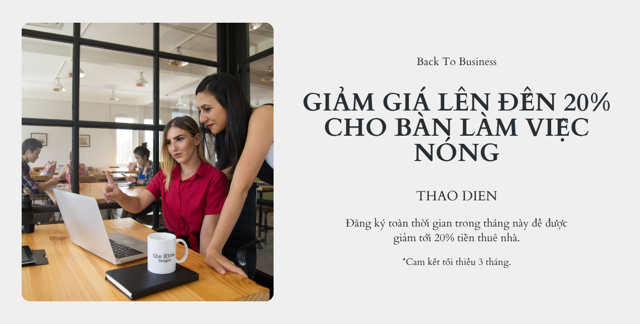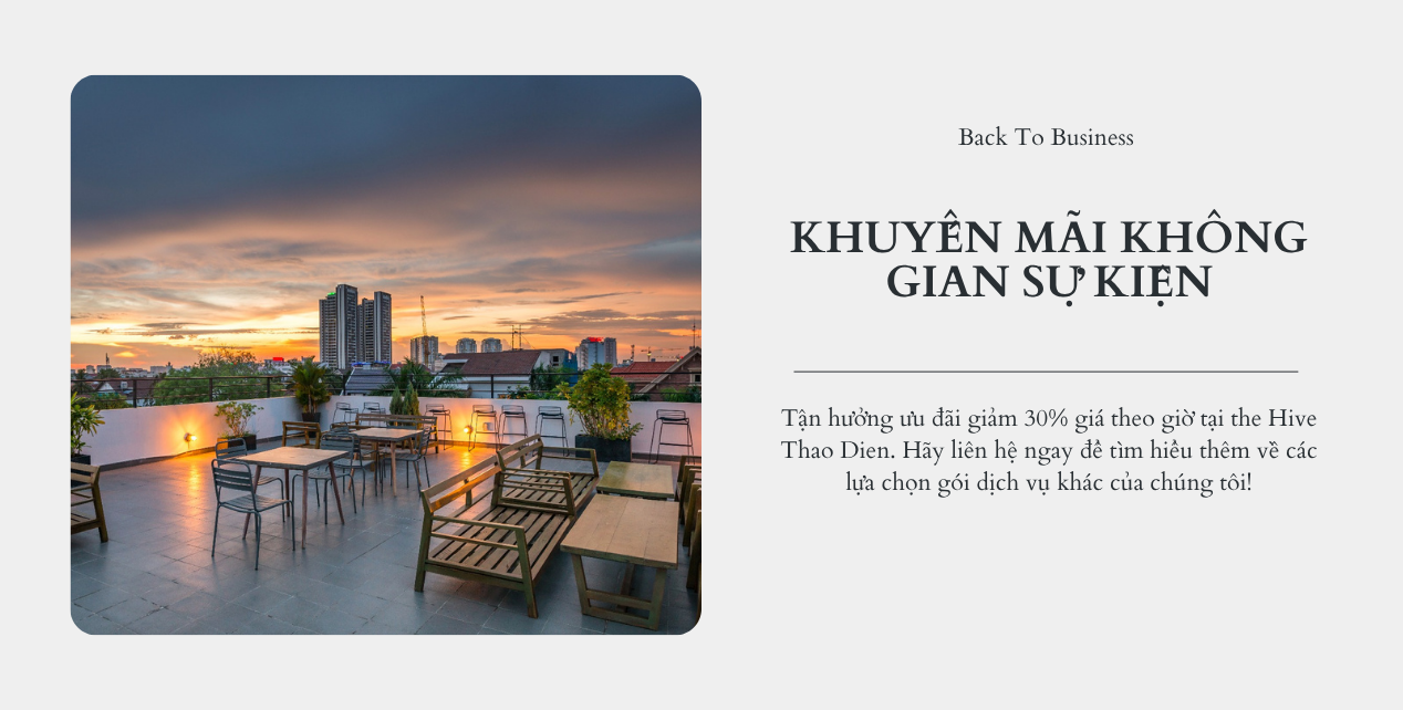 Tận hưởng ưu đãi giảm 30% giá theo giờ tại the Hive Thao Dien. Hãy liên hệ ngay để tìm hiểu thêm về các lựa chọn gói dịch vụ khác của chúng tôi!